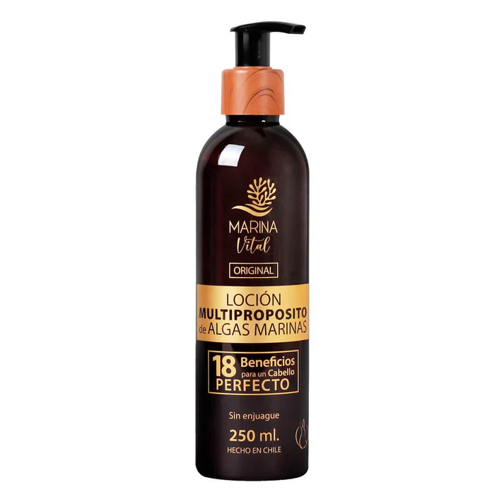 La Loción Multipropósito de Algas Marinas, tiene múltiples propiedades que ayudan a proteger y mejorar la hebra capilar. Principales beneficios:Hidrata, nutre y repara el cabello dañadoAumenta el brillo.Ideal para definir las ondas y controlar el encrespado.Protege del planchado y de la fricción del brushing.Previene las puntas partidas.Prolonga el tiempo de los tintes artificiales.Facilita la cobertura de canas.Ayuda a disminuir el picor en el cuero cabelludo.Acondiciona y desenreda el cabello rebelde.Suaviza el cabello y aporta volumen. Controla el frizz rebelde. No deja residuos, no es grasoso ni aceitoso. Modo de uso:En cabello recién lavado, quitar el exceso de agua y aplicar de medios a puntas.SIN ENGUAJE.